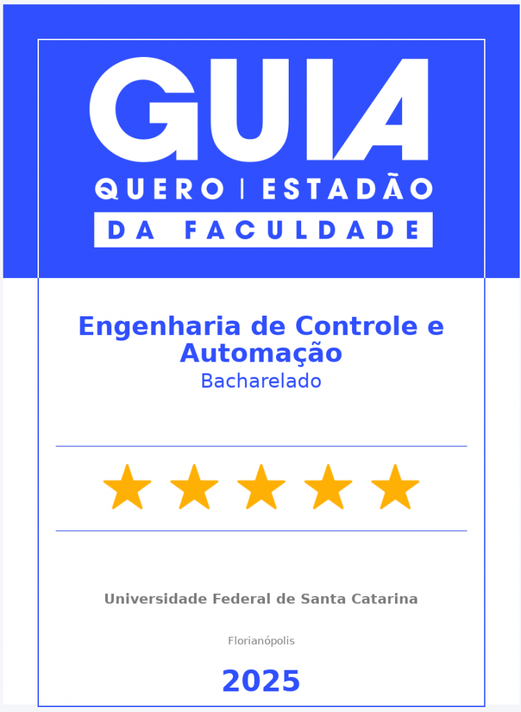 Na última edição do Guia da Faculdade da QUERO EDUCAÇÃO | ESTADÃO concedeu ao curso de graduação em Engenharia de Controle e Automação do CTC/UFSC a nota de avaliação máxima de 5 estrelas. Parabéns a todos os alunos e alunas, professores, técnicos, a coordenação do curso pelo reconhecimento recebido.